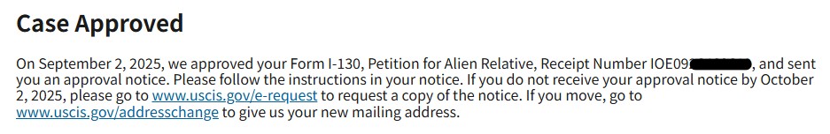 저희 이민법인 이음은 P님과 상담을 통해 I-130(부모 초청 청원) 신청을 안내드렸고, 지난 2024년 6월 청원서 접수를 도와드렸습니다. 그로부터 약 15개월의 심사기간을 거쳐 2025년 9월 청원서가 승인되셨습니다.